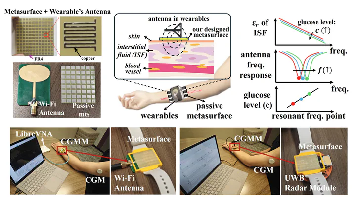 Non-invasive continuous glucose monitoring for diabetes patients remains challenging despite ongoing interest. This paper presents CGMM, a novel non-invasive wireless glucose monitoring system integrated into wearable devices. It features a specially designed metasurface that couples with the wearableβs antenna and tissue fluid beneath the skin, amplifying frequency response changes caused by subtle glucose concentration variations. To address individual tissue variability and optimize the passive metasurface design, we develop a tunable metasurface and a one-shot calibration method to obtain the impedance for optimal resonance in glucose sensing environments with unknown parameters. The calibrated impedance is then used for the inverse design and fabrication of an economical passive metasurface. We implement prototypes of CGMM and conduct extensive experimental evaluations. In human experiments involving ten participants using the prototype with LibreVNA, the overall performance is quantified with relative errors ranging from -5.02% to 6.93% and an RMSE of 9.65mg/dL.